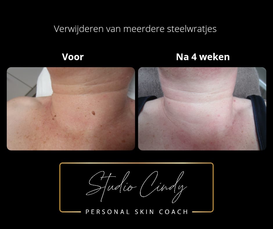 Karin stoorde zich al een tijdje aan de fibromen in haar hals en decolleté. Deze heb ik in één behandeling verwijderd met de T-away.