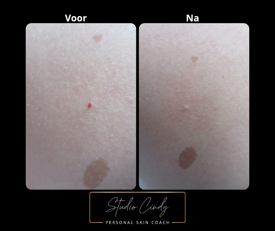 Bloedblaasjes zijn kleine rode blaasjes. Ze zijn onschuldig, maar veel mensen vinden het cosmetisch niet mooi. Dat vond Aniek ook. Ik behandelde de plek eenmalig met de T-Away en de bloedblaasjes zijn nog nauwelijks zichtbaar. Aniek was er blij mee.